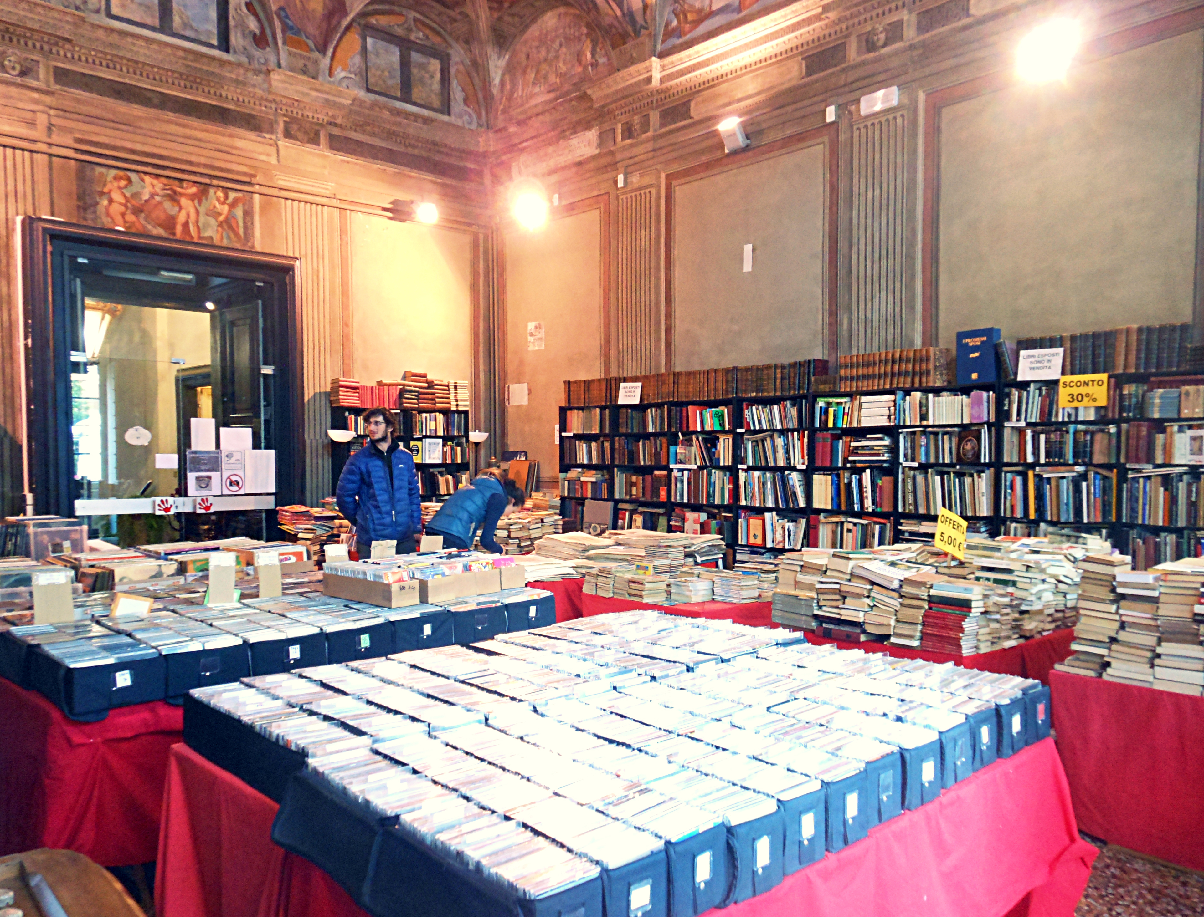 Nella sala centrale accatastati come in un grande biblioteca libri vecchi e antichi, 33 giri in vinile, cd e dvd, carte nautiche, manifesti originali..