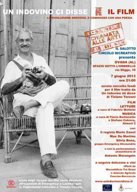 Nel corso della serata il regista Mario Zanot presenterà il progetto del film tratto da Un indovino mi disse. Con lui Max De Martino, fotografo e coordinatore del sito internet ufficiale dedicato a Tiziano Terzani. Interverrà anche Silvia Bona, volontaria del gruppo Emergency di Alessandria.