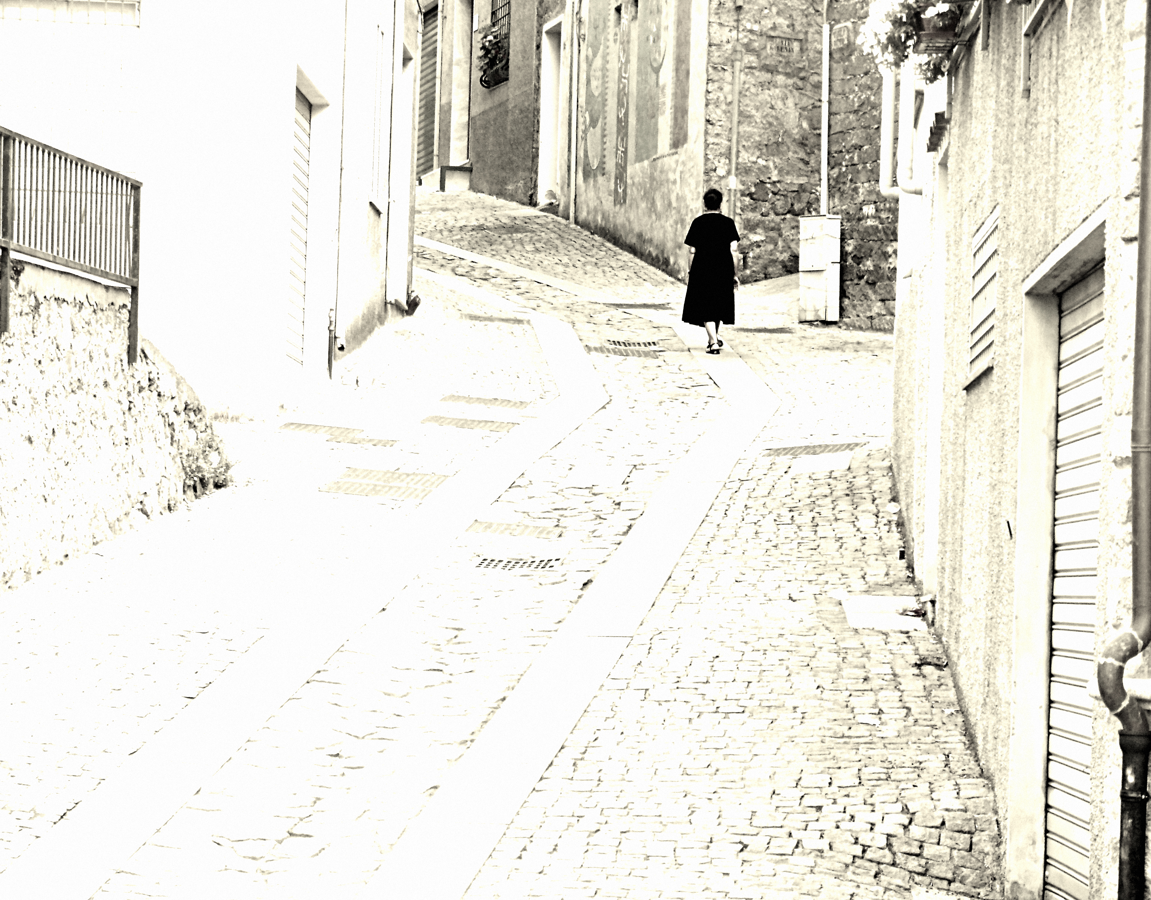 Dicevo due. Una è comparsa all’improvviso, veloce nel percorrere un breve tragitto su una strada bianca e con una luce accecante, quasi un fantasma nero: la testa bassa, il gonnellone nero che ondeggiava ad ogni passo… Ora che gli uomini sono tornati a casa, definitivamente, lo spazio esterno ritorna di loro proprietà. Alle donne anziane non rimangono che pochi passi veloci, furtivi.