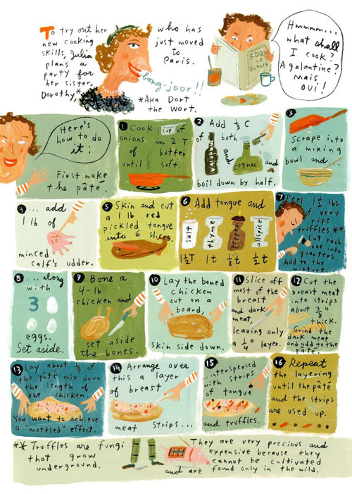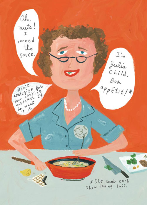 Tra le splendide illustrazioni si trovano illustrati i trucchi culinari della Child e il contenuto delle sue ricette: