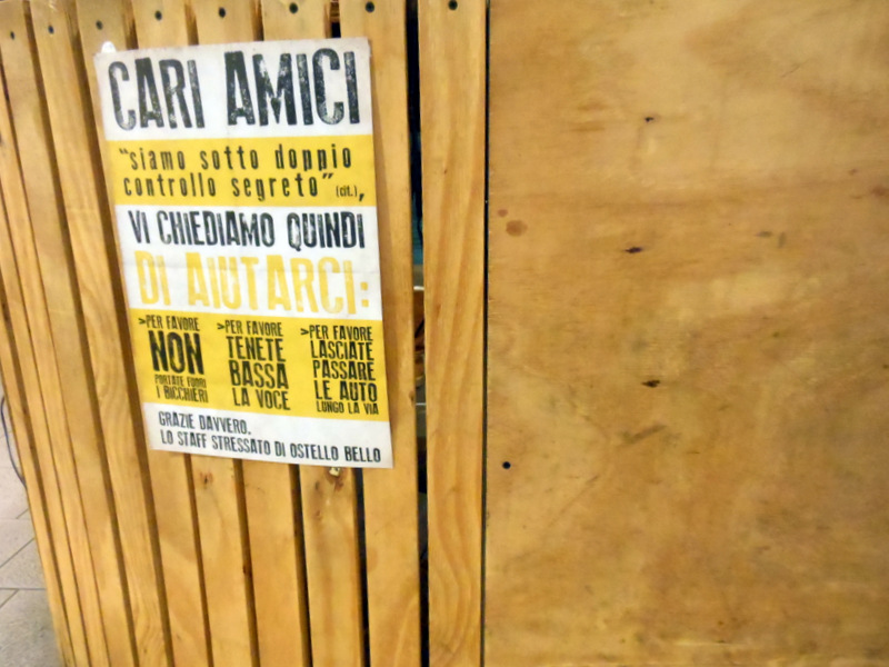 E dà da lavorare ad una ventina di persone, tutte giovani. Vi pare poco? Era chiaro da subito che avrebbe avuto successo per quell’ambiente creativo, poco italiano e molto molto international, ma non ha avuto vita facile all’inizio, in tanti si sono messi in mezzo per creare ostacoli e problemi http://www.ilfattoquotidiano.it/2012/06/07/chi-ha-paura-di-ostello-bello/255198/ Ha avuto la meglio, anche se è tenuto costantemente sotto controllo: tant’è che un cartello invita a comportamenti corretti e riguardosi, e questo alla fine è anche un vantaggio per chi nei pressi dell’Ostello vive, dimostrando così che giovane è anche educato e civile.