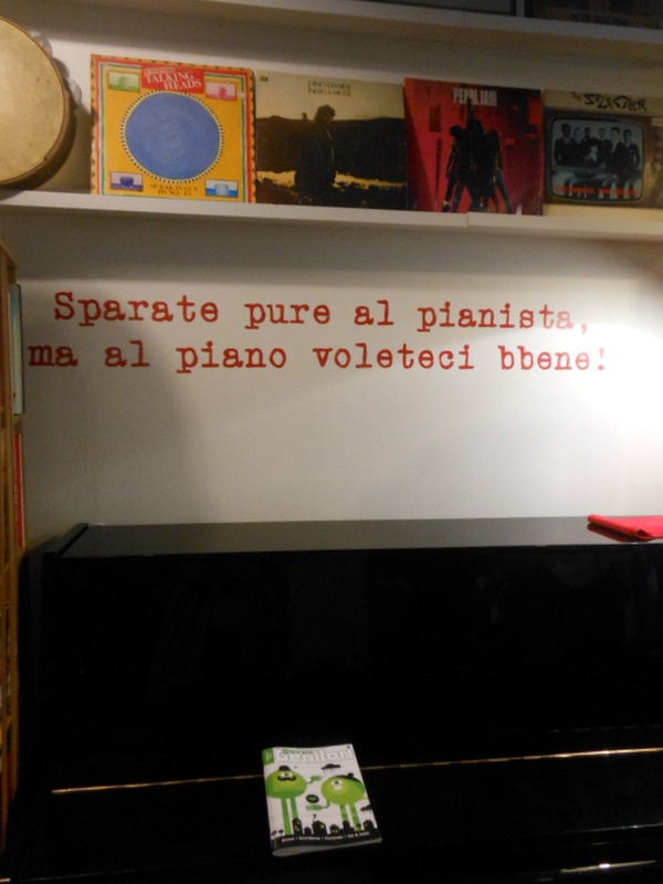 C’è un pianoforte per chi sa suovare, la bacheca per le attività di gruppo tipo, che so, le gite fuoriporta, lo scaffale con le guide turistiche …