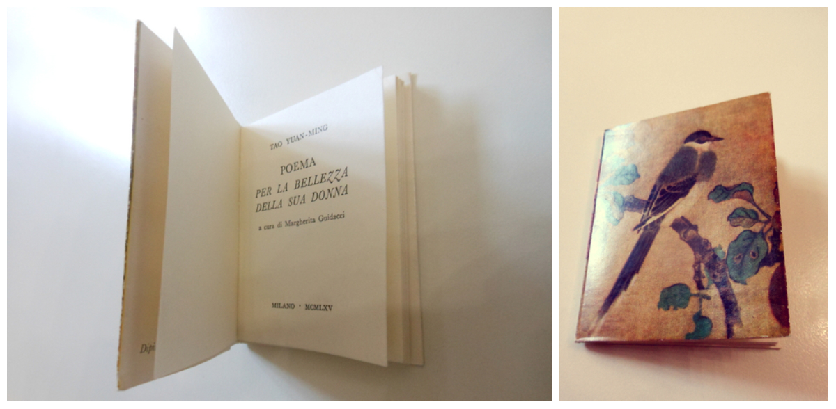Il librino contiene il Poema per la bellezza della sua donna, composto come risposta ad una dissertazione tra filosofi sul controllo delle emozioni per la tranquillità dell’animo. In copertina un particolare di un dipinto su seta di Pien Wen-tsin pittore attivo alla Corte dei Ming, autore di opere delicate che hanno come soggetti uccelli e fiori.