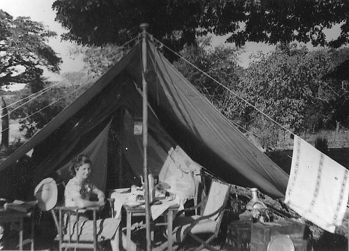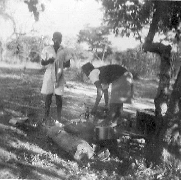 Una sera, un Padre proveniente dalla Missione di Ovada, posta a circa un miglio di distanza al di là del fiume, venne a farci visita e rimase a chiacchierare con noi per un’ora o poco più. Ogni mattina, a colazione, avevamo un cerchio di spettatori , che rimaneva a fissarci nel loro tragitto sino alla scuola della Missione fino a quando non li costringevamo ad allontanarsi. Probabilmente non avevano mai visto una donna bianca prima di allora. Per fortuna le notti erano fresche e l’ultima sera accendemmo un fuoco davanti alla tenda perché era più freddo del solito. Mangiammo pollo, uova e latte comprati sul luogo e verdure in scatola che avevamo portato con noi. Vivere nella savana è molto più economico che vivere in un piccolo paese o in una città. L’unico inconveniente è che ci si stanca di mangiare pollo!