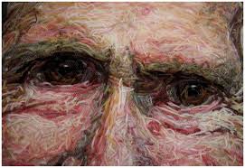hair slippersnake skin slipperDei suoi progetti  quello che mi ha colpito di più,  se posso dirlo, benevolmente, è quello dedicato alla madre, colpita da demenza. Ha dovuto per questo abbandonare il suo studio per occuparsi di lei. L’ha coinvolta nel suo progetto partendo dalle vecchie foto di famiglia  per realizzare un abito scultura  che attraverso i punti con cui era cucito riproducesse i volti dei familiari che la madre fosse in grado di riconoscere. Sono venuti poi i ritratti “cuciti” con fili lasciati cadere come immagini che si stessero dissolvendo. Alla fine i ritratti della madre, in diverse età,  che testimoniassero della sua esistenza, della sua vita, ma mano che la malattia, la perdita della memoria si sono aggravate. Sono stati esposti nel marzo del 2015 alla City Hall di Londra, in collaborazione con l’Alzheimers Society.