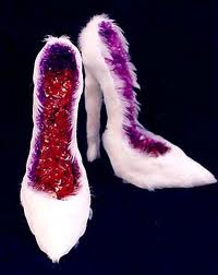 60c87f004e77f6dfd99809367e855c15Che l’artista si occupi di questioni sociali è nota. Ha realizzato scarpe/opere d’arte ad esempio per  testimoniare  delle ultime, per fortuna, donne cinesi che hanno avuto i piedi bendati, altrimenti detti “piedi di loto“: nome poetico attribuito ad una pratica brutale. Interessanti, sono a questo proposito, le foto della fotografa inglese Jo Farrell
