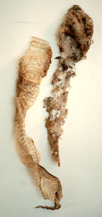 indexPasseggiata nel bosco. Sono il completamento di un abito che fu realizzato dopo aver camminato attraverso un bosco mai attraversato prima e quindi fu un’esperienza di scoperta. Non rappresentano una protezione ma semmai una traccia. Sono state realizzate con del nylon rosa, scheletri di foglie secche, bruciacchiate con una torcia e ricamate sui bordi con fili argentati e blu. In quest’opera il cambiamento e la trasformazione sono rappresentati dai tanti luoghi in cui sono state realizzate. L’artista le ha portate con se e assemblate su autobus, treni, metropolitana, caffè, incontri…ovunque stesse seduta. I colori e la loro consistenza alludono alla bellezza dell’ambiente e della natura e alla loro decadenza. Ma anche alla muta di un serpente, dico io…