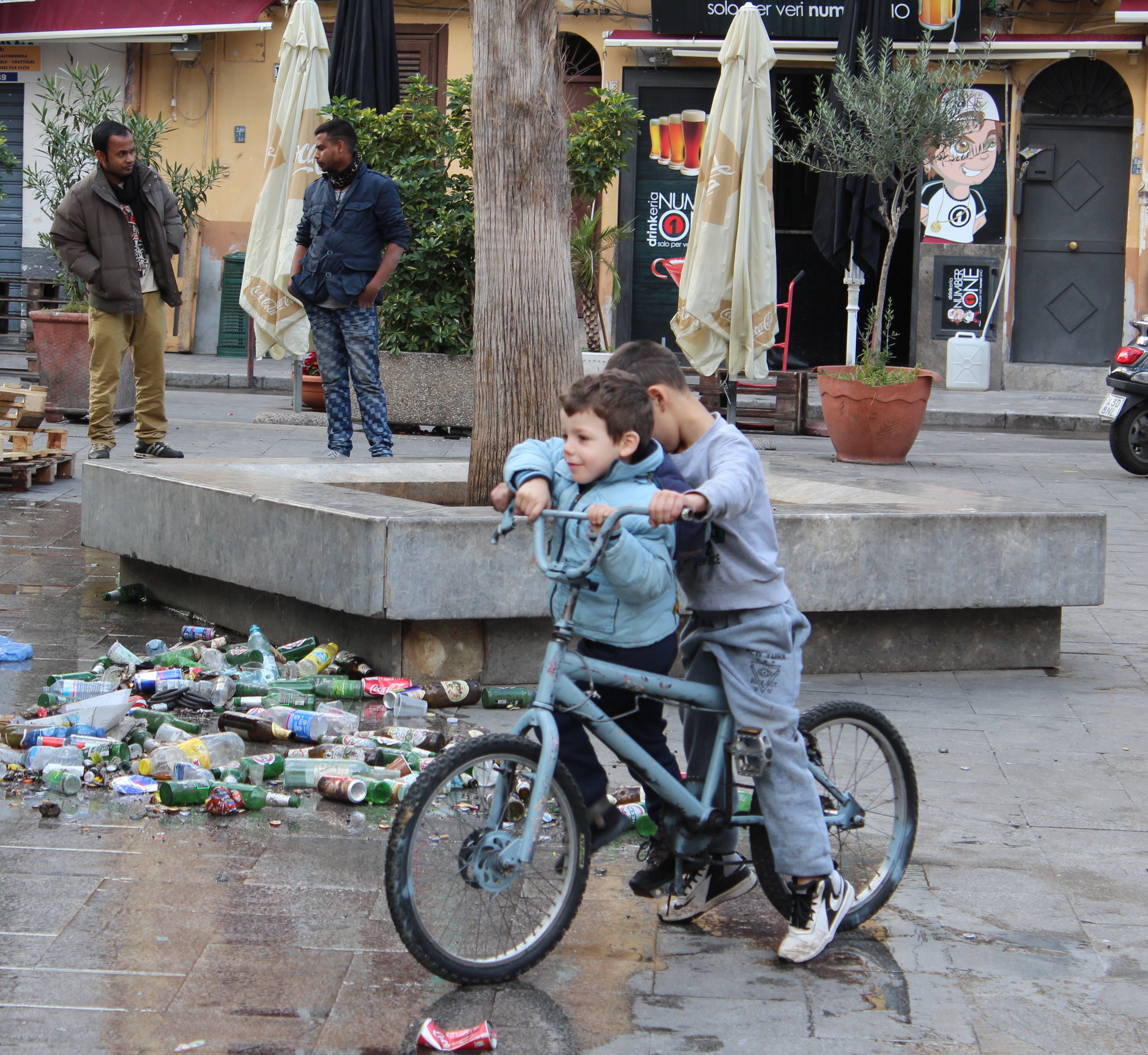 Bambini si rincorrono in mezzo a mucchi di bottiglie di birra, forse abbandonate dopo i festeggiamenti di capodanno. Si avvicinano, si sfottono, ci chiedono di fare delle foto. Sono così diversi dai bambini del nord, non hanno diffidenza, sono abituati a vivere in mezzo alla strada, tra gli adulti. E noi non facciamo di certo paura. Chiediamo di accompagnarci al campetto di calcio, quello che abbiamo visto in TV. Di accompagnarci non ne hanno voglia e al campetto ci arriviamo da soli. E’ più deprimente di quello che ricordiamo, costretto com’è tra i palazzi degradati: modello “Don Giuseppe”, quello dell’8 x 1000 per intenderci, direbbe mio figlio. Qui il campetto è arrivato grazie al rapper Picciotto che ha attivato un progetto di crowfunding. Picciotto insegna ai bambini ad esprimersi con il rap, nel tentativo di limitare il vuoto provocato dall’alto tasso di dispersione scolastica.